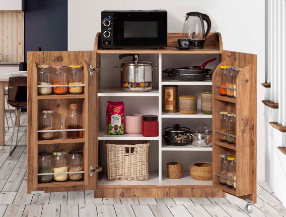 Kapak içi raflar 3 kavanoz alabilecek genişlikte tasarlanmış olup, alt kısmında bulunan tekerlek desteği sayesinde kapaklar daha rahat açılır ve dolap daha uzun ömürlü kullanım sunar.