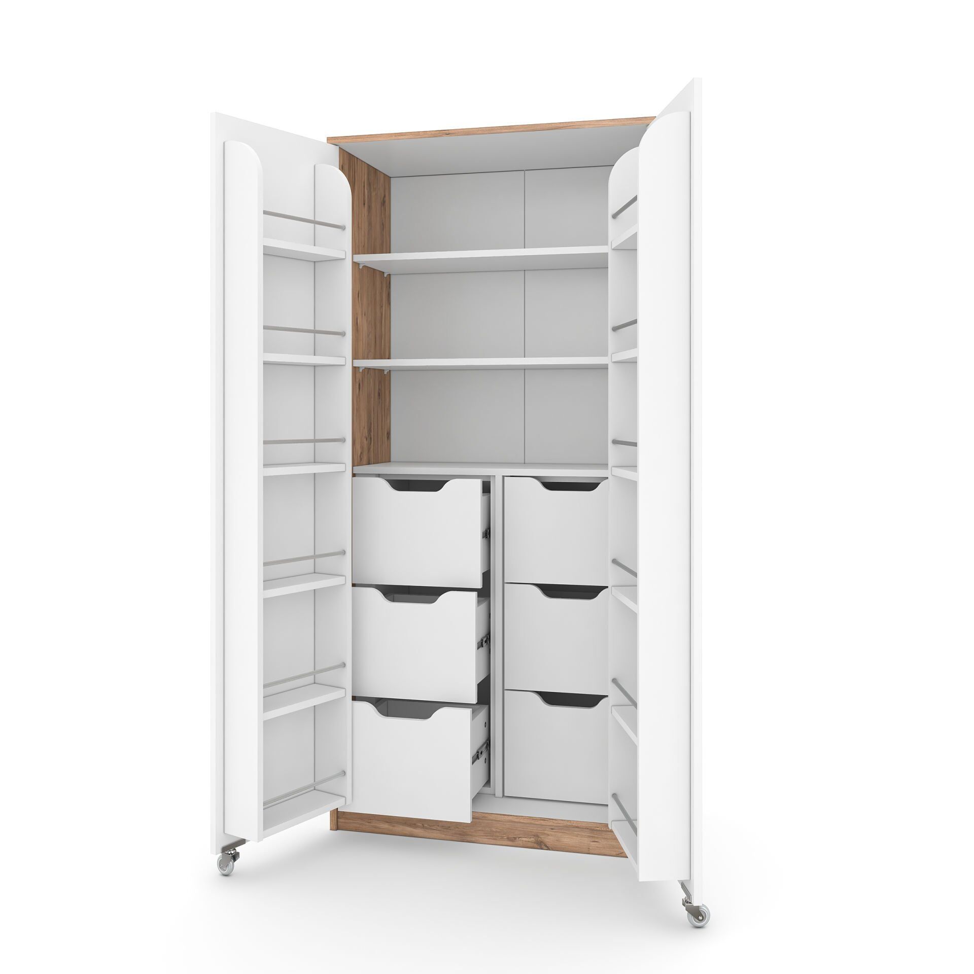 Çekmeceler modüler olarak gönderildiği için istediğiniz zaman çıkarabilir ve raflı olarak kullanabilirsiniz. 18 mm kalınlığında E1 sertifikalı birinci sınıf sunta malzemeden üretilen bu dolap, uzun yıllar size eşlik etmek ve yükünüzü hafifletmek için tasarlandı. İster Atlantik çam renginin sıcaklığını evinize taşıyabilir, ister tertemiz bir görüntü için tamamen beyaz seçebilir veya gövdesi Atlantik çam, kapakları beyaz olarak tercih edip tarzınızı yansıtabilirsiniz. Kapaklarındaki raflara 1 litrelik klasik kavanozlar rahatça sığar.