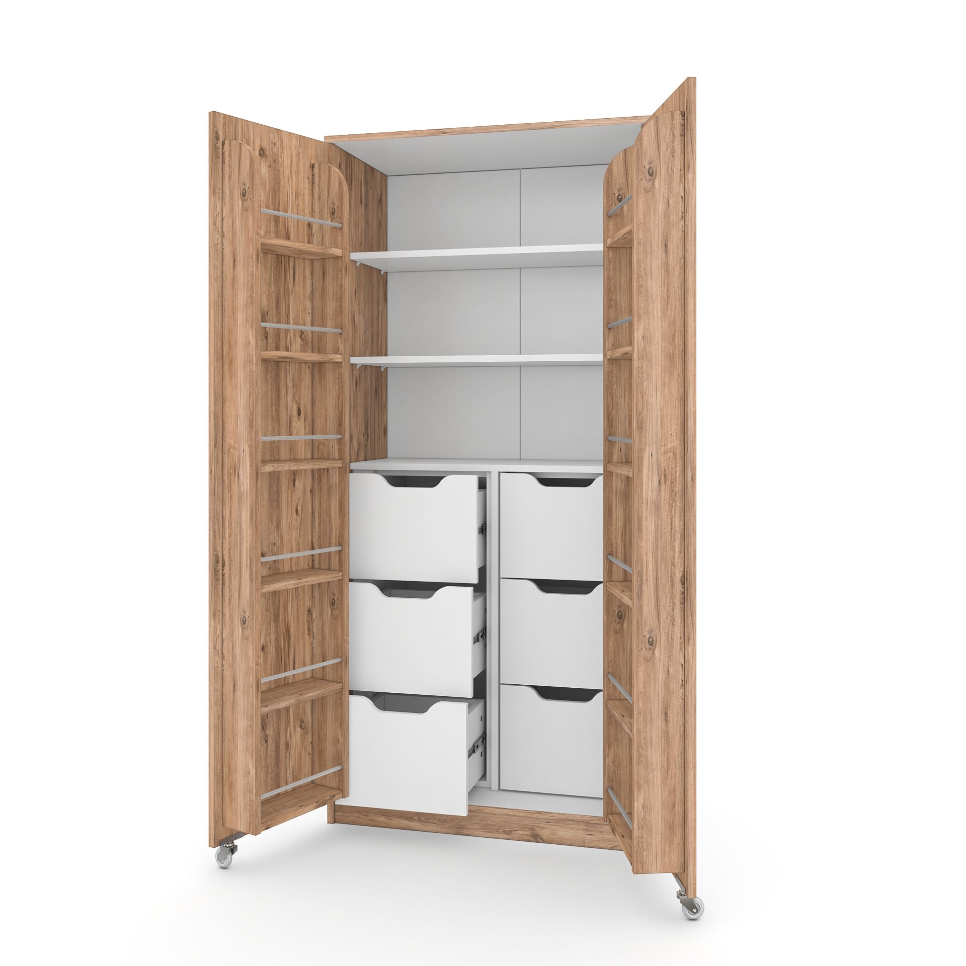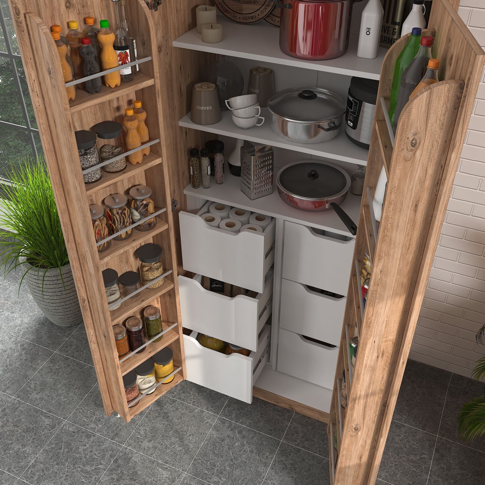 Çekmeceler modüler olarak gönderildiği için istediğiniz zaman çıkarabilir ve raflı olarak kullanabilirsiniz. 18 mm kalınlığında E1 sertifikalı birinci sınıf sunta malzemeden üretilen bu dolap, uzun yıllar size eşlik etmek ve yükünüzü hafifletmek için tasarlandı. İster Atlantik çam renginin sıcaklığını evinize taşıyabilir, ister tertemiz bir görüntü için tamamen beyaz seçebilir veya gövdesi Atlantik çam, kapakları beyaz olarak tercih edip tarzınızı yansıtabilirsiniz. Kapaklarındaki raflara 1 litrelik klasik kavanozlar rahatça sığar.