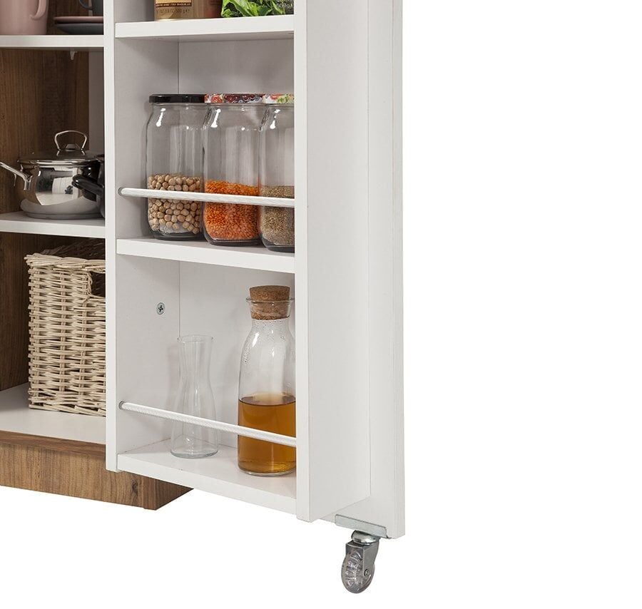Çekmeceler modüler olarak gönderildiği için istediğiniz zaman çıkarabilir ve raflı olarak kullanabilirsiniz. 18 mm kalınlığında E1 sertifikalı birinci sınıf sunta malzemeden üretilen bu dolap, uzun yıllar size eşlik etmek ve yükünüzü hafifletmek için tasarlandı. İster Atlantik çam renginin sıcaklığını evinize taşıyabilir, ister tertemiz bir görüntü için tamamen beyaz seçebilir veya gövdesi Atlantik çam, kapakları beyaz olarak tercih edip tarzınızı yansıtabilirsiniz. Kapaklarındaki raflara 1 litrelik klasik kavanozlar rahatça sığar.