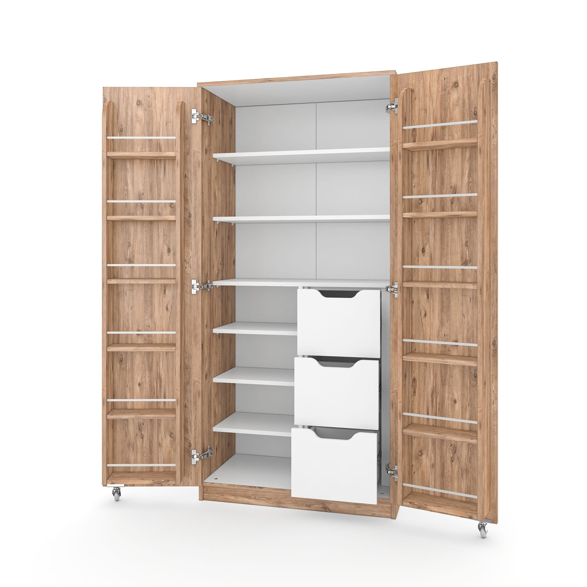 Çekmeceler modüler olarak gönderildiği için istediğiniz zaman çıkarabilir ve raflı olarak kullanabilirsiniz. 18 mm kalınlığında E1 sertifikalı birinci sınıf sunta malzemeden üretilen bu dolap, uzun yıllar size eşlik etmek ve yükünüzü hafifletmek için tasarlandı. İster Atlantik çam renginin sıcaklığını evinize taşıyabilir, ister tertemiz bir görüntü için tamamen beyaz seçebilir veya gövdesi Atlantik çam, kapakları beyaz olarak tercih edip tarzınızı yansıtabilirsiniz. Kapaklarındaki raflara 1 litrelik klasik kavanozlar rahatça sığar.
