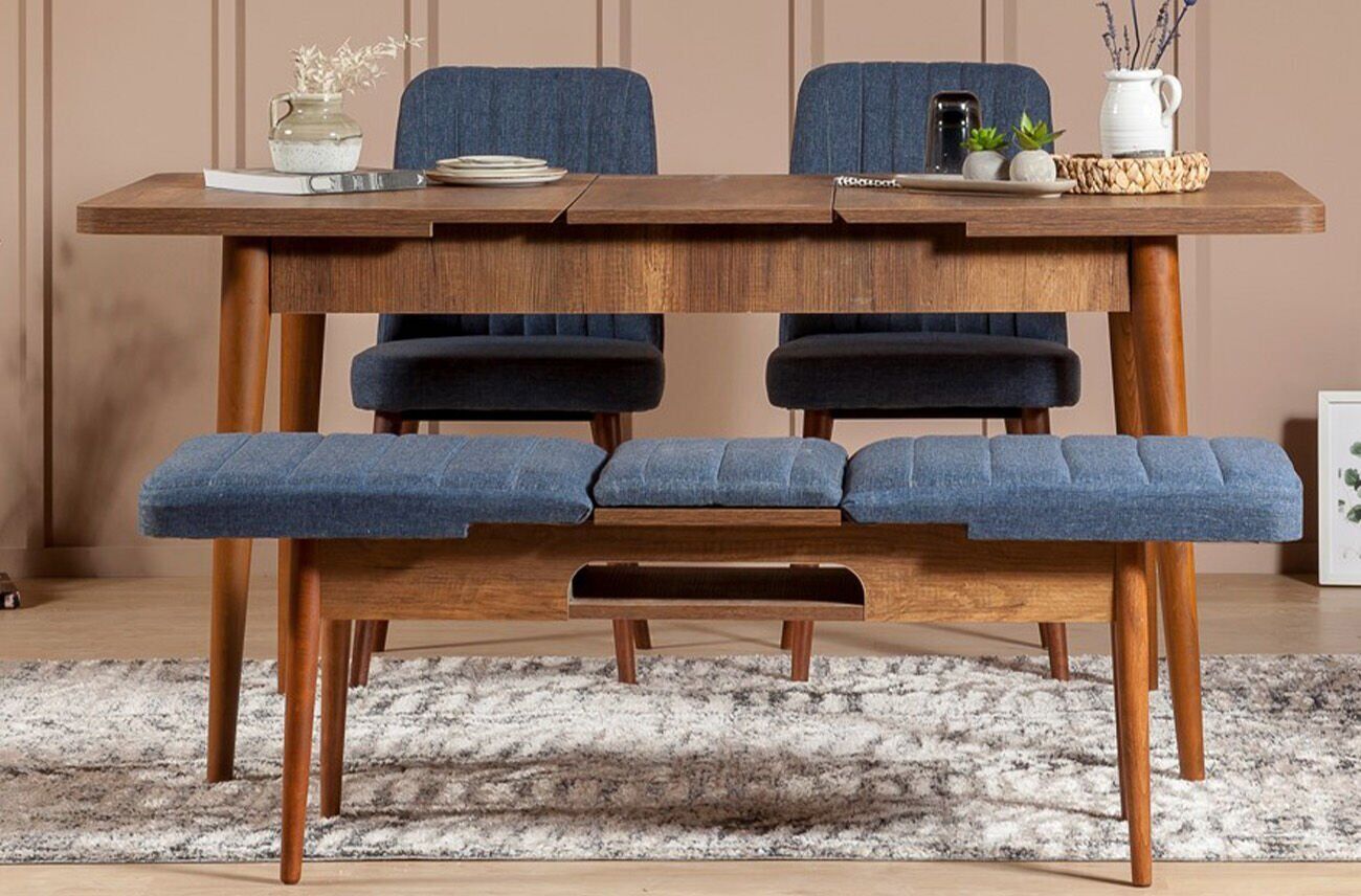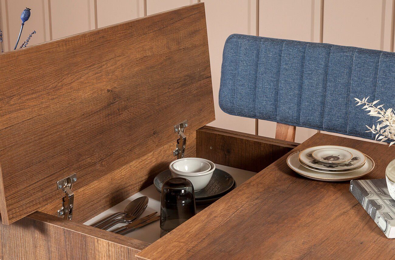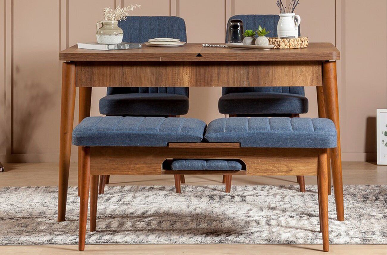 Sembol Masa Takımı ceviz lacivert renkli ürünümüzün takım içeriğini istediğiniz şekilde değiştirebilirsiniz. Masamızın orta bölümünde gizli kaşıklık bölümü mevcuttur. Kaşıklık bölümünü masanın açık halinde kullanabilirsiniz. Masa, sırtlı bank ve bench yonga levha malzemeden üretilmiştir. Masa takımımızın ayaklarının malzemesi ahşaptır. Kumaş olarak keten malzeme kullanılmıştır ve kolay silinebilir özelliktedir.